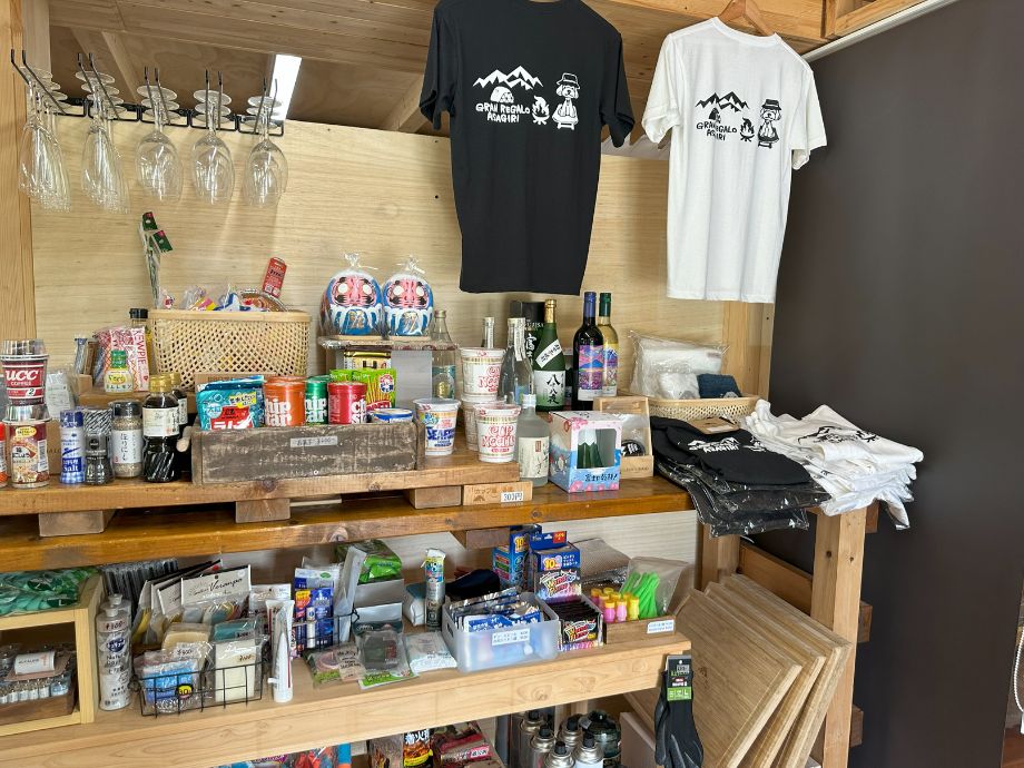 インスタント食品からキャンプグッズ、オリジナルTシャツまであって眺めてるだけでも楽しい空間。