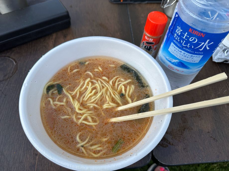 これ以上ないくらいのズボラメニューだけど、涼しい高原の朝に食べるインスタント麺は