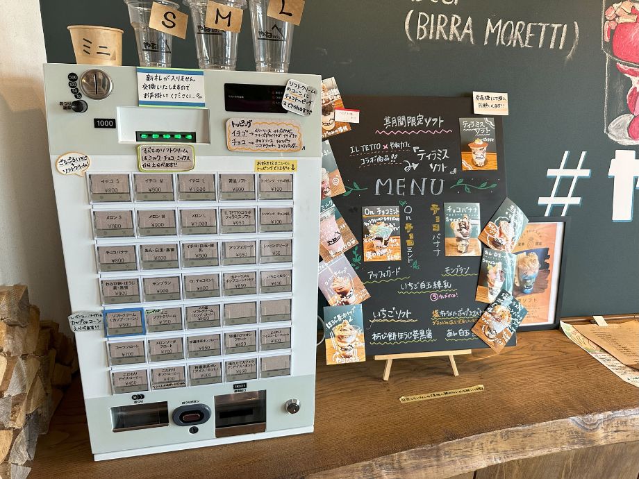やねカフェは券売機でパフェやソフトを購入するスタイルで、気軽にテイクアウト感覚で