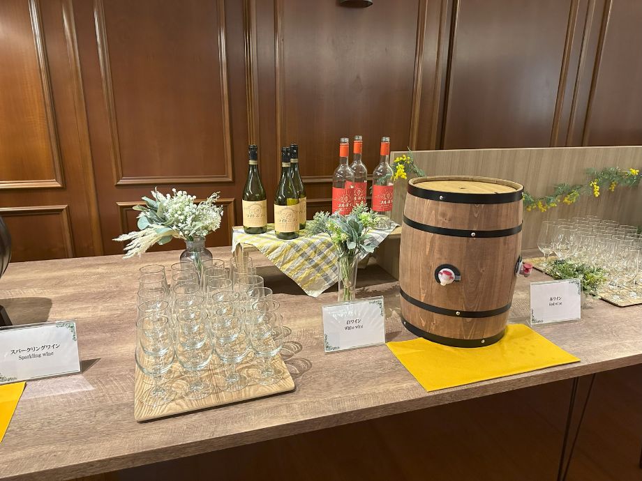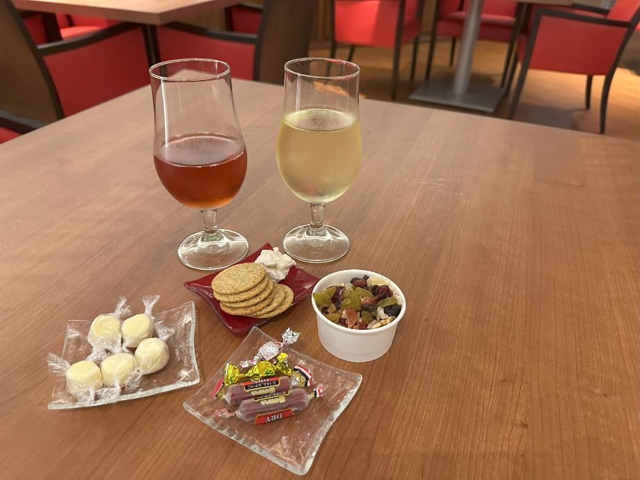 赤・白・スパークリングワイン、コーヒー各種に加えて、クラッカー・いぶりがっこチーズ・ドライフルーツ・ミックスナッツなど軽いつまみが揃っていました。