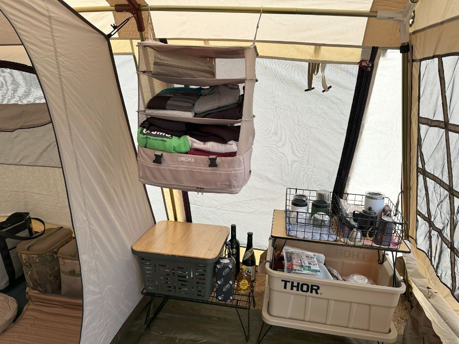 洋服も小物もポイッと入れるだけで整う優れもの。子連れキャンプでもテント内がスッキリ✨