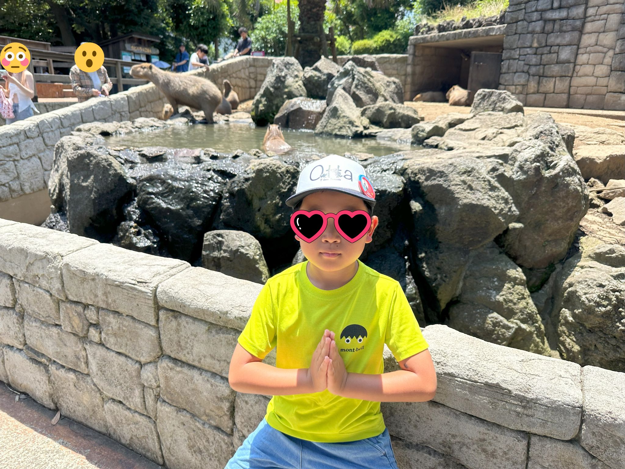 石垣で囲まれたエリアに、のんびりくつろぐカピバラたち🐹♨️